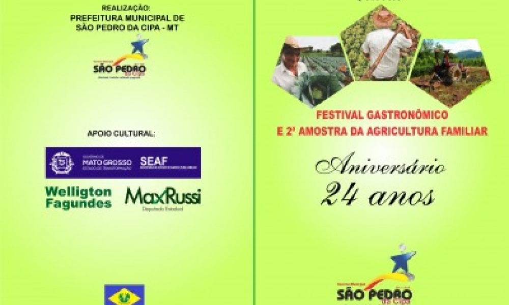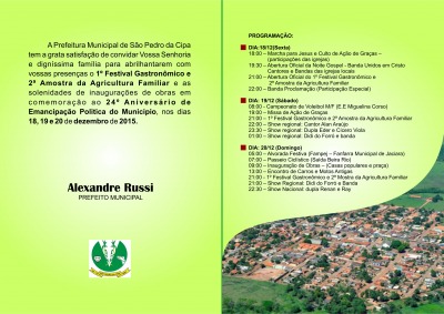 A Prefeitura Municipal de São Pedro da Cipa tem a grata satisfação de convidar Vossa Senhoria e digníssima Família para abrilhantarem com vossas presenças o Festival Gastronômico e 2ª Amostra da Agricultura Familiar e as solenidades de inaugurações de obras em comemoração ao 24º Aniversario de Emancipação Politica do Município, nos dias 18,19 e 20 de dezembro de 2015. Programação: Dia 18/12/2015 (Sexta - Feira) 18:00 horas Marcha para Jesus e Culto de Ação de Graças 19:30 Abertura Oficial da Noite Gospel - Banda Unidos em Cristo 21:00 Abertura Oficial do 1º Festival Gastronômico e 2 Amostra Agricultura Familiar 22:00 - Banda Proclama��o (Participa��o Especial) Dia 19/12/2015 (S�bado) 08:00 - Campeonato de voleibol M/F (E.E. Miguelina Corso) 19:00 - Missa de A��o de Gra�as 21:00 - 1� Festival Gastron�mico e 2� Amostra da Agricultura Familiar 22:00 - Show Regional: Alan Araujo 23:30 - Show Regional: Dupla Eder e Cicero Viola 01:00 - Show Regional: Didi do Forr� e Banda 20/12/2015 (Domingo) 05:00 - Alvorada Festiva ( Fampej - Fanfarra Municipal de Jaciara 07:00 - Passeio Cicl�stico (sa�da Beira Rio) 09:00 - Inaugura��o de obras - (Casas populares e pra�a) 13:00 - Encontro de Carros e Motos Antigas 21:00 - 1� Festival Gastron�mico e 2� Amostra da Agricultura Familiar 21:00 - Show Regional: Didi do Forró e Banda 22:30 - Show Nacional: Dupla Renan e Ray