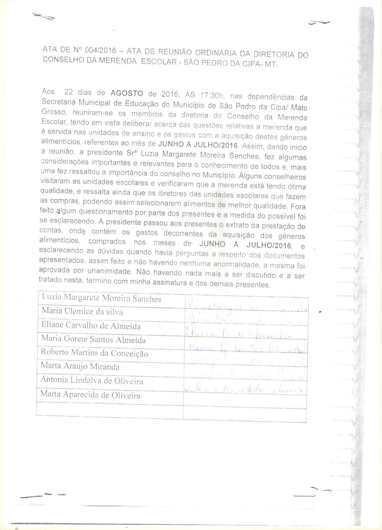 Assunto: ATA DE NUMERO 004/2016, ATA DE REUNIÃO ORDINÁRIA DA DIRETORIA DO CONSELHO DA MERENDA ESCOLAR- SÃO PEDRO DA CIPA-MT